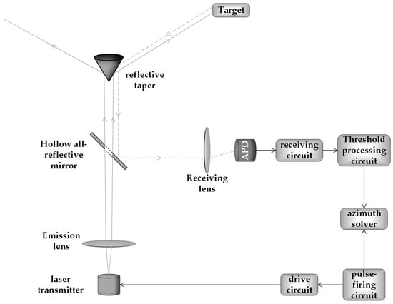 This study is based on a single-pulse laser proximity static circumferential detection system using a light cone beam-expanding mechanism. The main components are the beam-expanding light cone and the laser proximity detection unit, the principle of which is illustrated in Figure 1. At the beginning of the detection process, a drive circuit triggers the laser transmitter and emits a laser pulse, which marks the starting moment of the distance measurement. The pulsed laser emitted passes through the hollow total reflection mirror after lens shaping and forms a static circumferential detection field through the beam expansion of the light cone. The laser signal that detects the target is reflected. Moreover, the echo signal will be collected by the inverted reflection light cone. Next, it is reflected by the hollow total reflection mirror and finally focused by the receiving lens to the highly sensitive photosensitive detector, represented by APD (Avalanche Photo Diode). The received echo signal realizes the static circumferential detection of the target through processing and calculation [13].