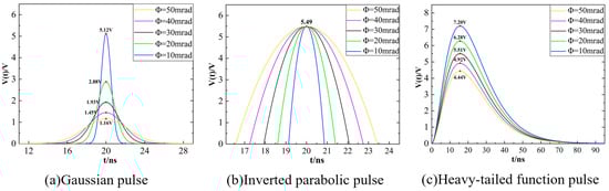Figure 5 demonstrates the effect of the laser pulse divergence angle on the echo time profile of the three pulsed signal waveforms. As shown in Figure 5, the pulse width of the ranging laser echo signal changes with the divergence angle of the beam. This is because the laser reflected from the center and the edges of the spot travel different paths back to the detector, causing photons from different parts of the same emitted pulse to arrive at the detector at different times, thereby temporally broadening the received echo pulse; Figure 6 shows the effect of the laser pulse divergence angle on the circumferential detection probability density distributions of the three pulsed signal waveforms. With the laser pulse’s divergence angle increases, the slopes of its threshold discrimination points become smaller, the amplitude of the echo signals of the Gaussian and heavy-tailed function pulses decreases, and the amplitude of the echo signals of the inverted parabolic function pulses remains basically unchanged. Their probability density distribution is gradually shifted to the left, and the peak half-pulse width is increased, i.e., the ranging accuracy decreases with the increase in the dispersion angle. In comparison, the outgoing laser pulse signal of the inverted parabolic function has the highest probability of detection when the pulse laser emission angles are the same.
