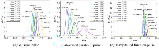 The emission power of the pulsed laser directly affects the slope of the echo threshold resolution point. This section explores the influence of emission power on the ranging probability distribution for three types of laser pulse waveforms. It does so by altering only the emission power of the laser pulse signals. The threshold detection voltage is set to 600 mV, the laser emission pulse width is 7.8 ns, the equivalent rms noise voltage is set to 70 mV, the outgoing angle is 30°, and the emitted power is varied between 10 W and 30 W in 5 W steps.