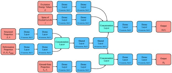 Each input branch undergoes two dense transformations to capture relevant feature interactions before being concatenated to form a unified representation. This concatenated output is then passed through shared hidden layers designed to extract common patterns across these inputs, such as the influence of shell effects and collective excitations. The shared features are further processed by task-specific branches to predict (i) the cumulative number of excited states as a function of excitation energy and (ii) the mean resonance spacings , which serve as experimental validation for the theoretical predictions.