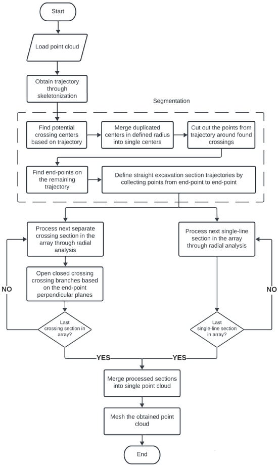 The procedure up to this point is shown on the flowchart in Figure 3. The end result is a trajectory that requires further processing, although it will be different between single-line sections of the excavation and its crossroads. For that, a segmentation of the excavation network is necessary.