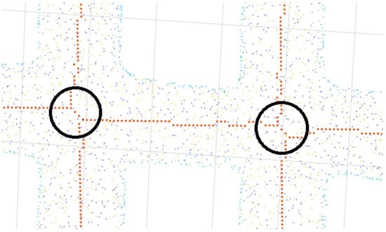 Example of doubled crossings. Orange points—points obtained from skeletonization. Other point colors—original point cloud data. Black circles highlight exact areas with doubled crossings.