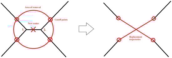 Example of crossing trajectory processing from 2D perspective. Left side—calculation of unified ne crossroad center based on detected, close crossroad centers (1 and 2) and removal of points inside specified radius (area of removal). Right side—generating new crossroad trajectories connecting previous cutoff points (that are defined as points intersected by the circle).