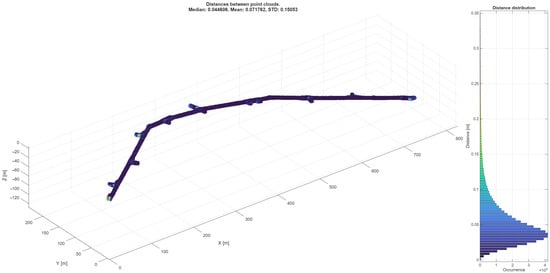 In terms of required algorithm accuracy, very fine detail changes in geometry have very small impact on the overall airflow. The general requirement could be taken from the industry point of view, as the result could be used to obtain economical gains—as a mean to find the spots in geometry, where fixing the surface geometry will optimize the airflow enough to be considered a good investment. Such calculation would consider materials/work cost to potential ventilation cost reduction ratio, although this topic can be considered as future work. The fine line between the uncertainties of processing (and the measurement error of the scanning device) and at what point it becomes unnecessary to provide better results—this is hard to strictly define. Better density of measured points (such as Riegl Vz-400i that was used in the previous article) allow the proposed algorithm to go below 100 µm of median accuracy and below 1cm of standard deviation of accuracy, which in the case of airflow simulation might be unnecessary and it would be better to apply faster scanning method rather than obtaining such precision.