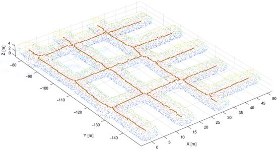 The complete scanned point cloud can be seen in Figure 8. Changing colors of the point cloud represent a change in elevation. As can be seen, the data consist mostly of a single long excavation line with a series of protruding branches. Although some of the branches were dead ends, most of them are a part of further expanding branches that were not fully scanned.