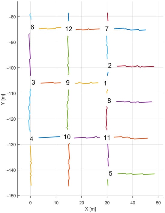 The result of segmentation can be seen in Figure 10. The algorithm properly segmented the obtained trajectory. The recesses that can be seen on the original point cloud Figure 8 between crossings 2 and 7 have not been detected as separate sections, as the skeletonization algorithm automatically removes branches below the set threshold. This means that these recesses will be processed through a single-line processing part of the algorithm.
