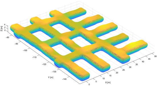 The effect of point cloud skeletonization can be seen in Figure 9. This is a raw trajectory that goes through the middle of the excavation shape. At this point of the processing it has a stepped shape, since the skleletonization has been run on the voxel grid with a size of 20 cm. This will be corrected for segmented long-line sections of the network by smoothing (linear interpolation). This approach is much better than setting a smaller grid cell size, as it has a large impact on the skeletonization processing time while providing almost identical results. The trajectory intersections visible on the crossing will be segmented in a circle of 5 m from the center of the crossing. This parameter has to be individually set for the excavation networks according to the expected size of the crossings (which is usually relative to the diameter of the cross-section).