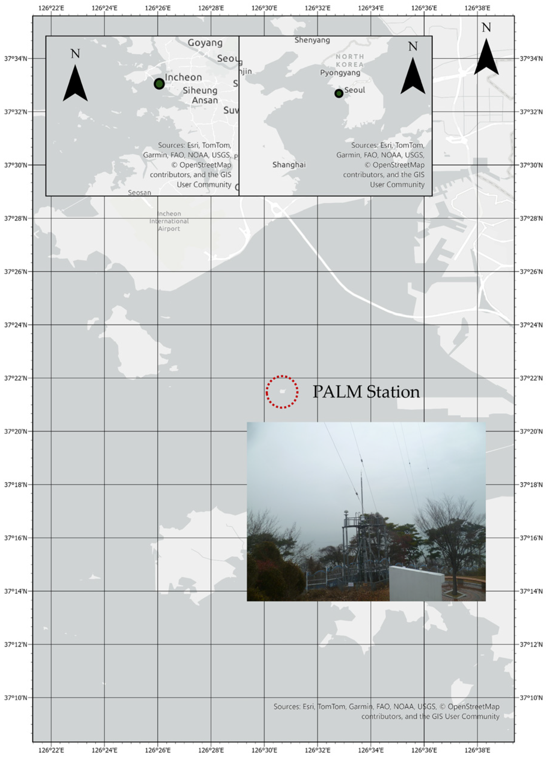 Figure 1), located in the Incheon coastal region of the Korean Peninsula, was selected as the study site due to its proximity to one of the most pronounced tidal environments in East Asia. The area is influenced by semi-diurnal tides with substantial amplitudes, making it an ideal location for investigating vertical displacements induced by OTL. Palmido is situated near the entrance of the Incheon harbor, where tidal variations strongly affect coastal infrastructure, navigation, and sustainable water management practices.