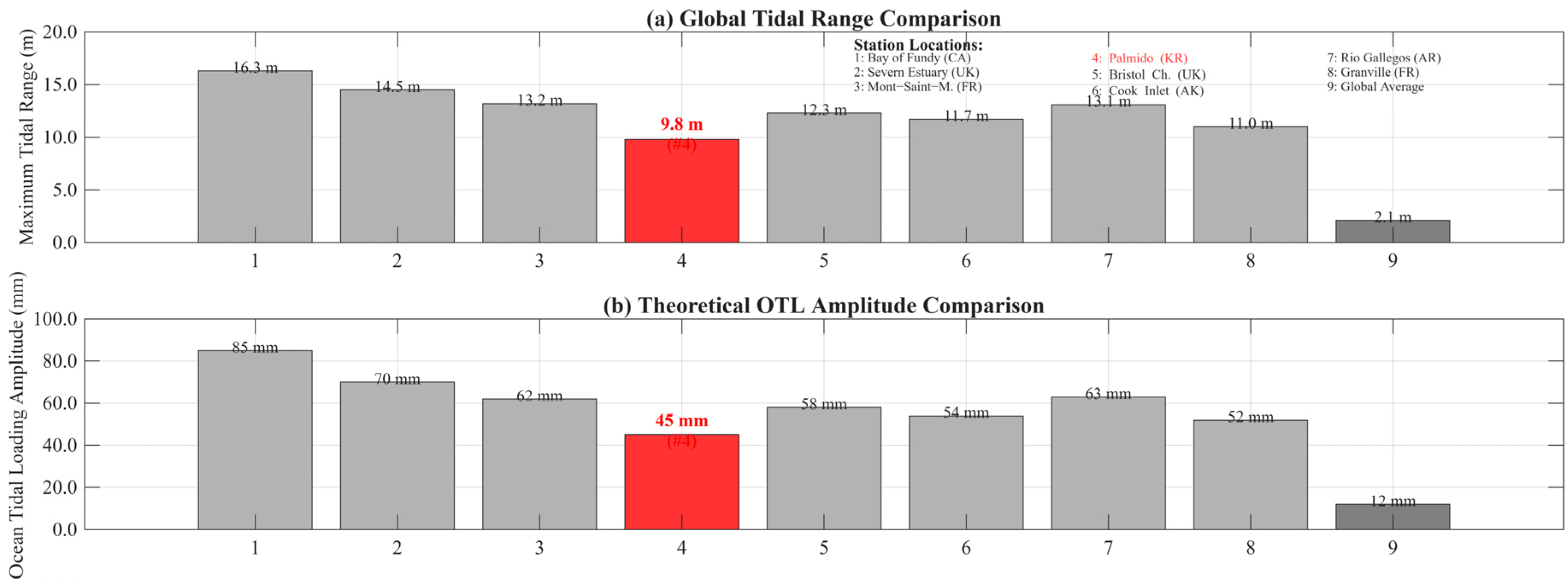 Figure 2 highlight the exceptional tidal characteristics of Palmido in comparison to other global tidal stations. The maximum tidal range at Palmido, shown in panel (a), is significantly larger than that of other locations, underscoring the extreme tidal environment of the site. Panel (b) further emphasizes Palmido’s distinctiveness, with the theoretical OTL amplitude being notably higher than that of other global stations. These findings reinforce Palmido’s suitability as an ideal site for high-precision tidal loading analysis, particularly due to its unique tidal conditions.
