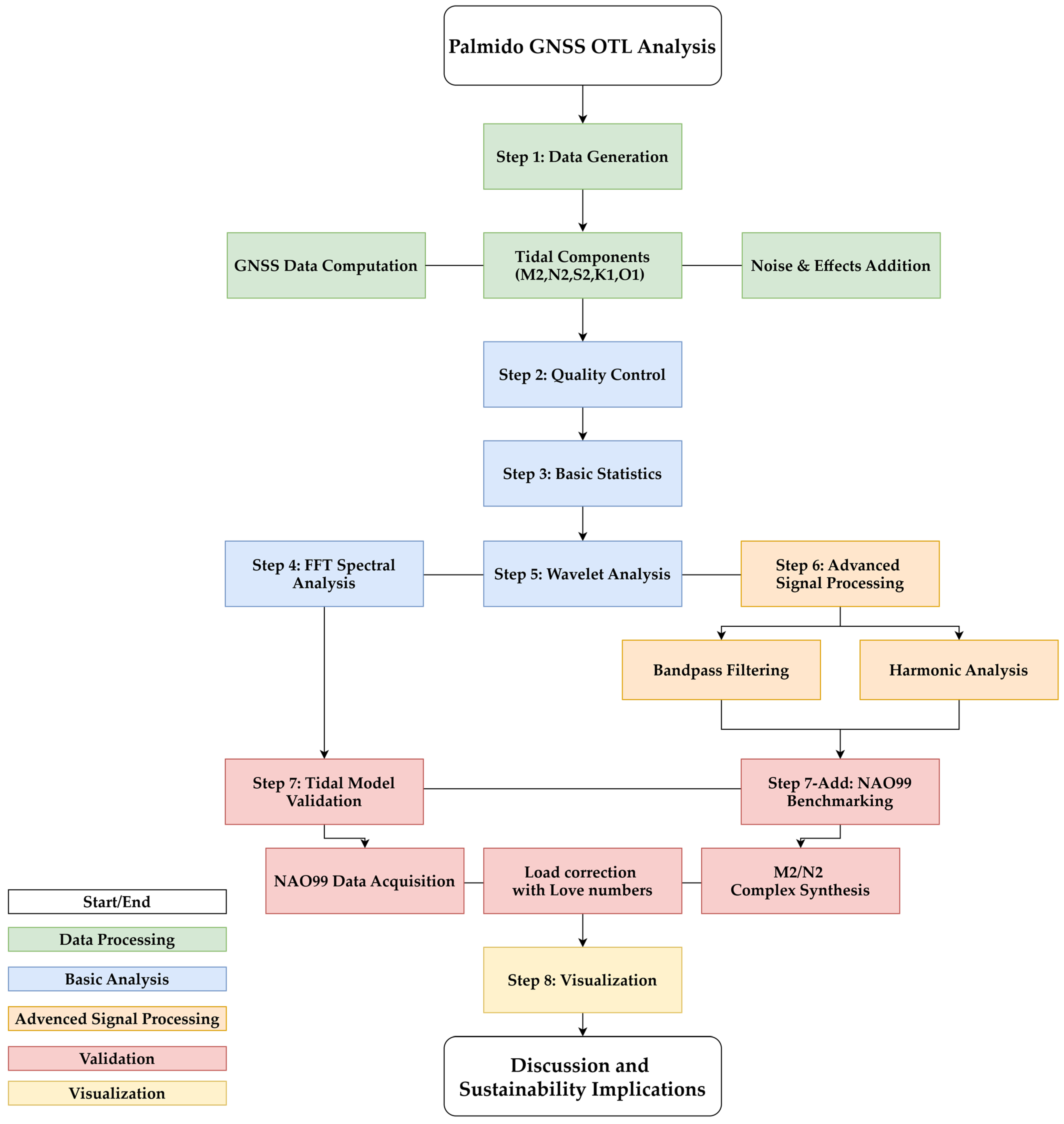 Figure 3 provides an overview of the end-to-end workflow used in this study. The diagram traces the pipeline from GNSS data generation and constituent definition through quality control and basic statistics, followed by frequency-domain FFT analysis and time–frequency wavelet analysis. Advanced signal processing (band-pass filtering and least-squares harmonic analysis) feeds the validation stage, in which NAO99 constants are acquired and adjusted with LLNs, and M2/N2 complex synthesis is performed for benchmarking. The final block summarizes the visualization and the downstream interpretation used for discussion and sustainability implications. Color groupings indicate processing (green), basic analysis (blue), advanced signal processing (amber), validation (red), and visualization (yellow), and align with Methods