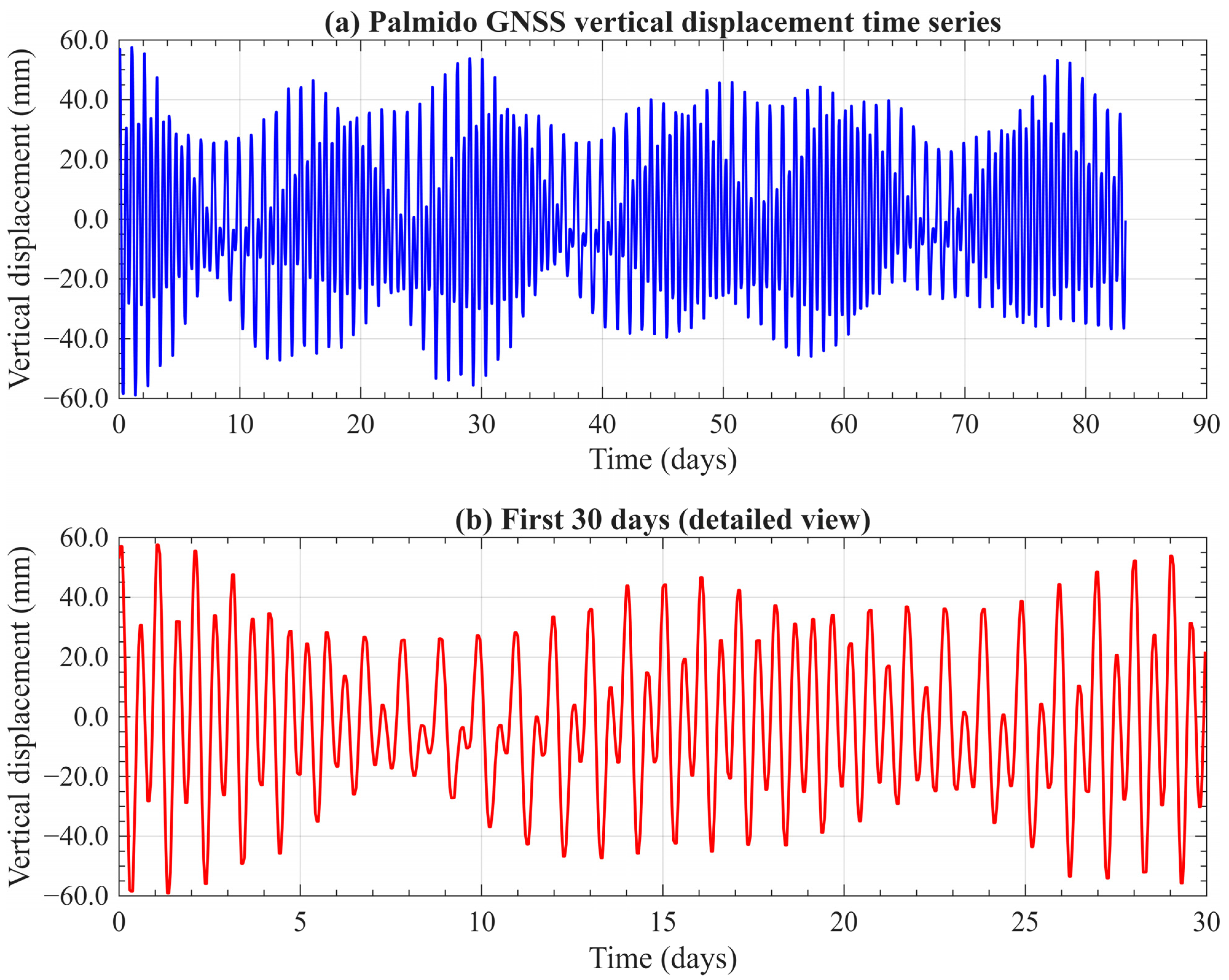 This dataset provides the basis for applying spectral and time–frequency decomposition methods, enabling a detailed assessment of the M2 and N2 tidal constituents. The high-quality and continuous nature of the Palmido GNSS record makes it well-suited for validating tidal loading models and developing reproducible methodologies for sustainable coastal geodetic monitoring.