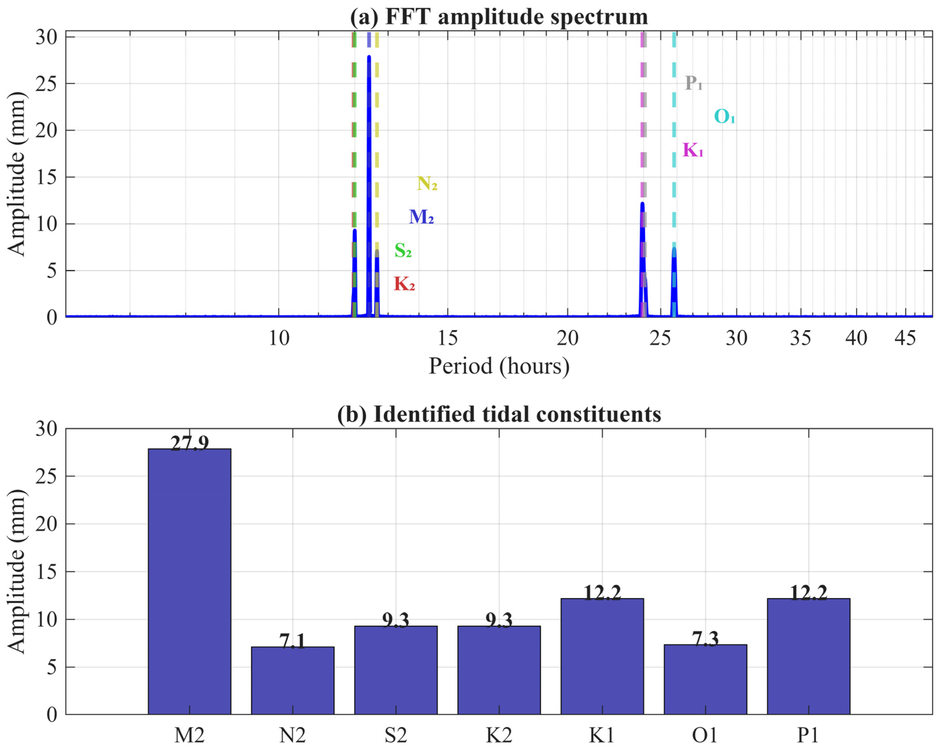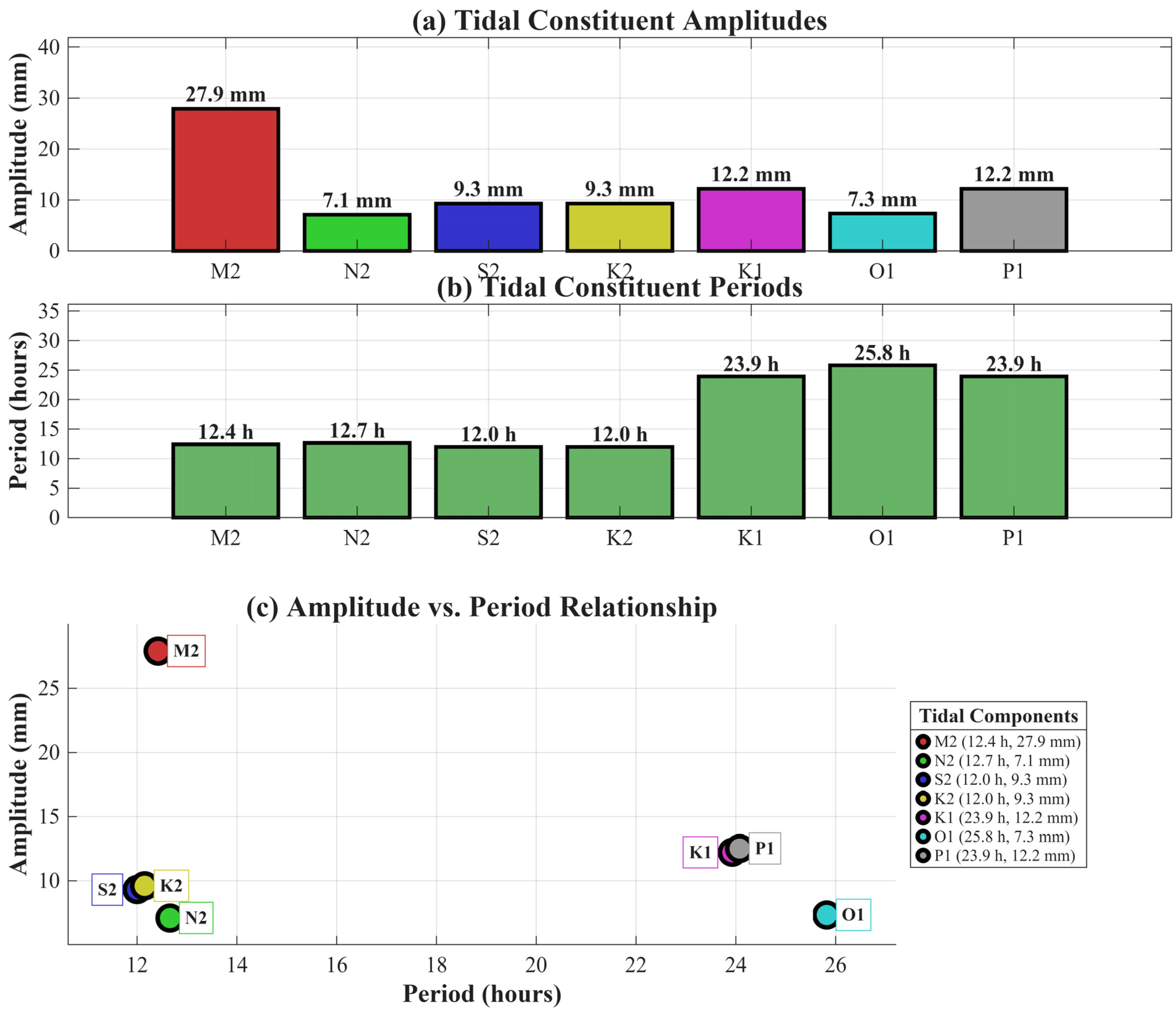 Figure 5a). Correcting for the window’s coherent gain restores attenuation-biased amplitudes and yields values commensurate with a macrotidal setting. The record length and zero-padding strategy clearly resolve the M2–N2 separation, while the chosen taper suppresses side-lobe energy. Constituent ranking indicates M2 (27.9 mm) as dominant, followed by K1 (12.2 mm), P1 (12.2 mm), S2 (9.3 mm), K2 (9.3 mm), O1 (7.3 mm), and N2 (7.1 mm) (