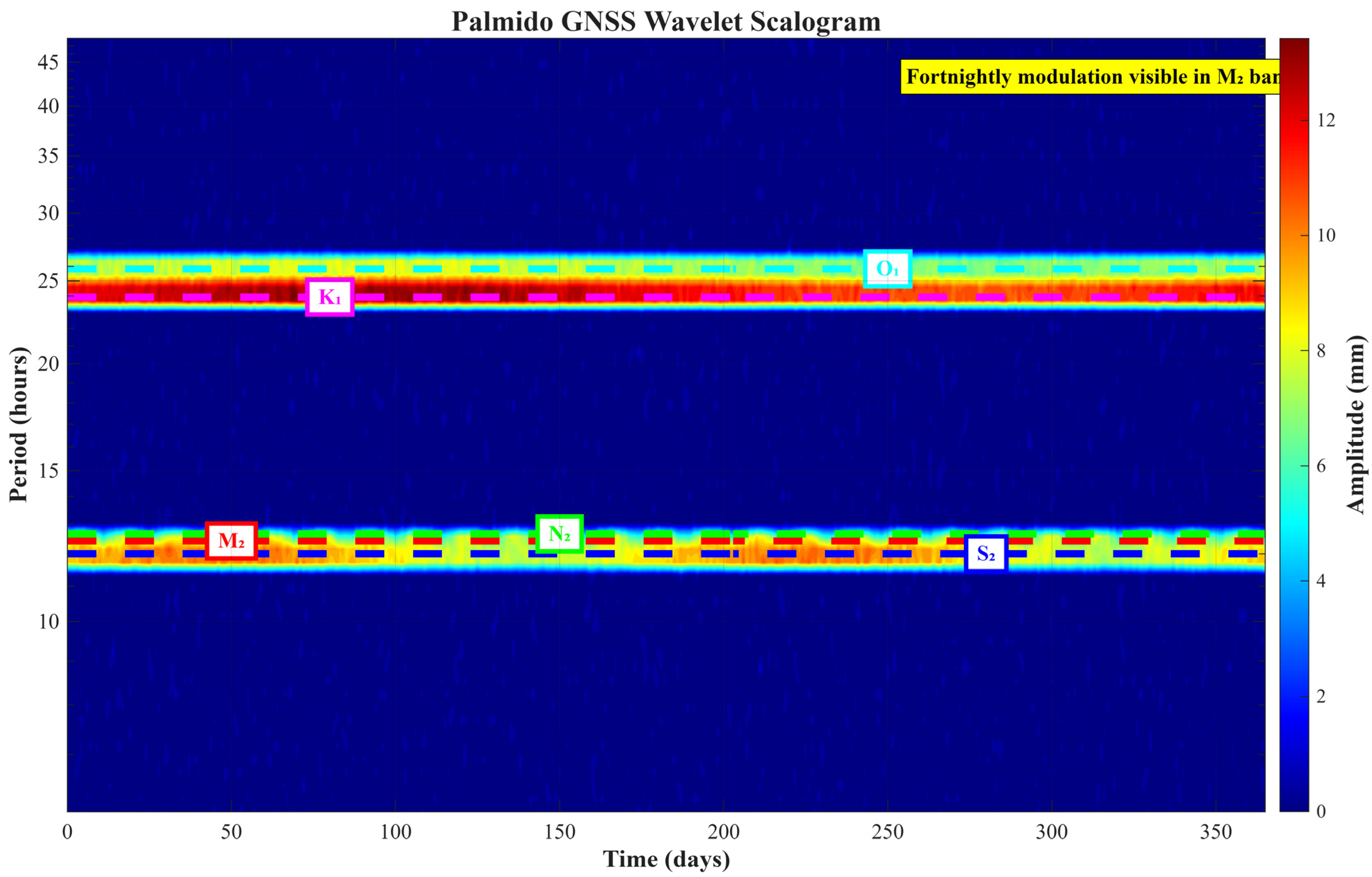 Figure 7), enabling rapid cross-checks between the FFT and the time–frequency view. The synthesis indicates that (i) semi-diurnal tides dominate the Palmido vertical response; (ii) N2 is detectable and temporally coherent, not a resolution artifact; and (iii) brief amplitude excursions coincide with periods of enhanced semi-diurnal interference. These outcomes provide a physically consistent basis for amplitude–phase benchmarking against NAO99 with load-Love-number corrections in