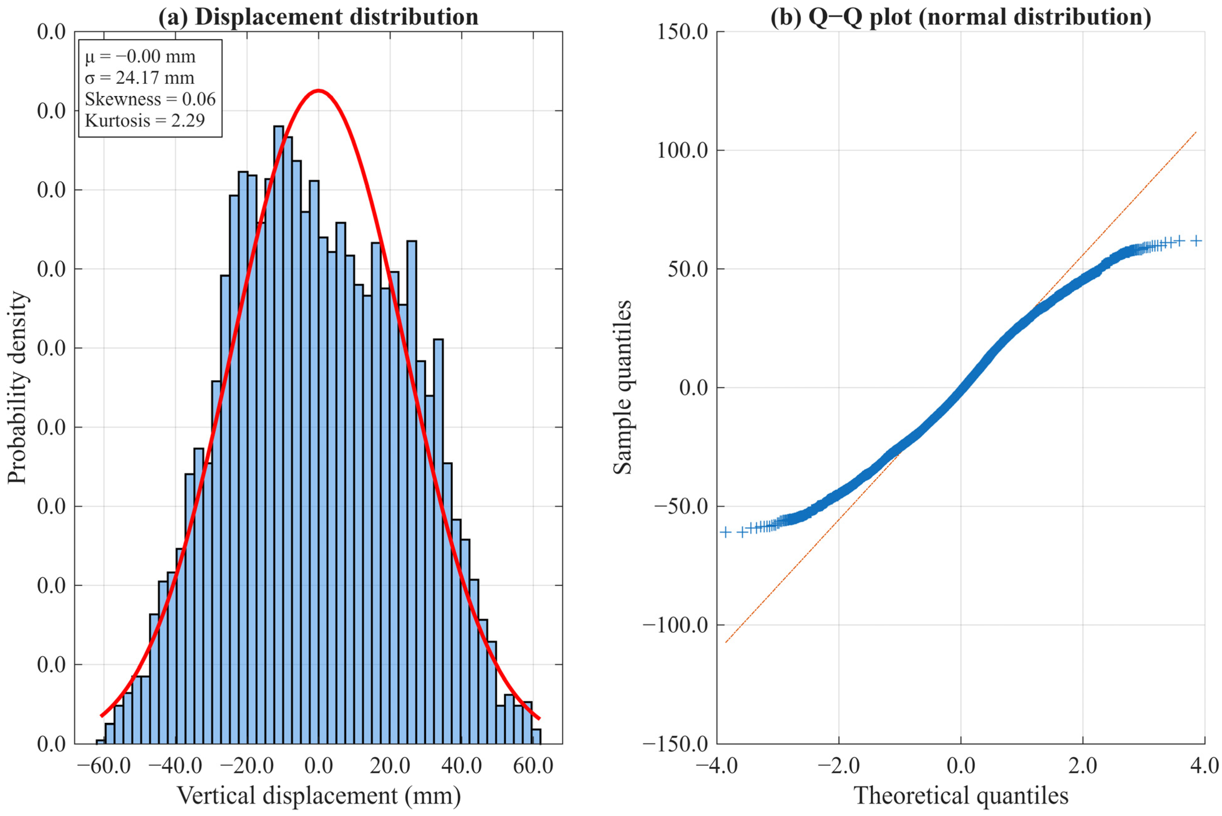 The statistical validation of the model outputs was conducted through histogram analysis and a Q-Q plot comparison to assess the distribution and normality of the data. The histogram of the vertical displacement data was constructed, showing the frequency distribution across defined intervals. A normal distribution curve was fitted to the histogram, providing a visual representation of how well the data aligns with a Gaussian distribution. Key statistical parameters, including the mean (μ = −0.01 mm) and standard deviation (σ = 24.18 mm), were calculated, along with skewness (0.06) and kurtosis (2.29), indicating a relatively symmetric distribution with lighter tails compared to a normal distribution.