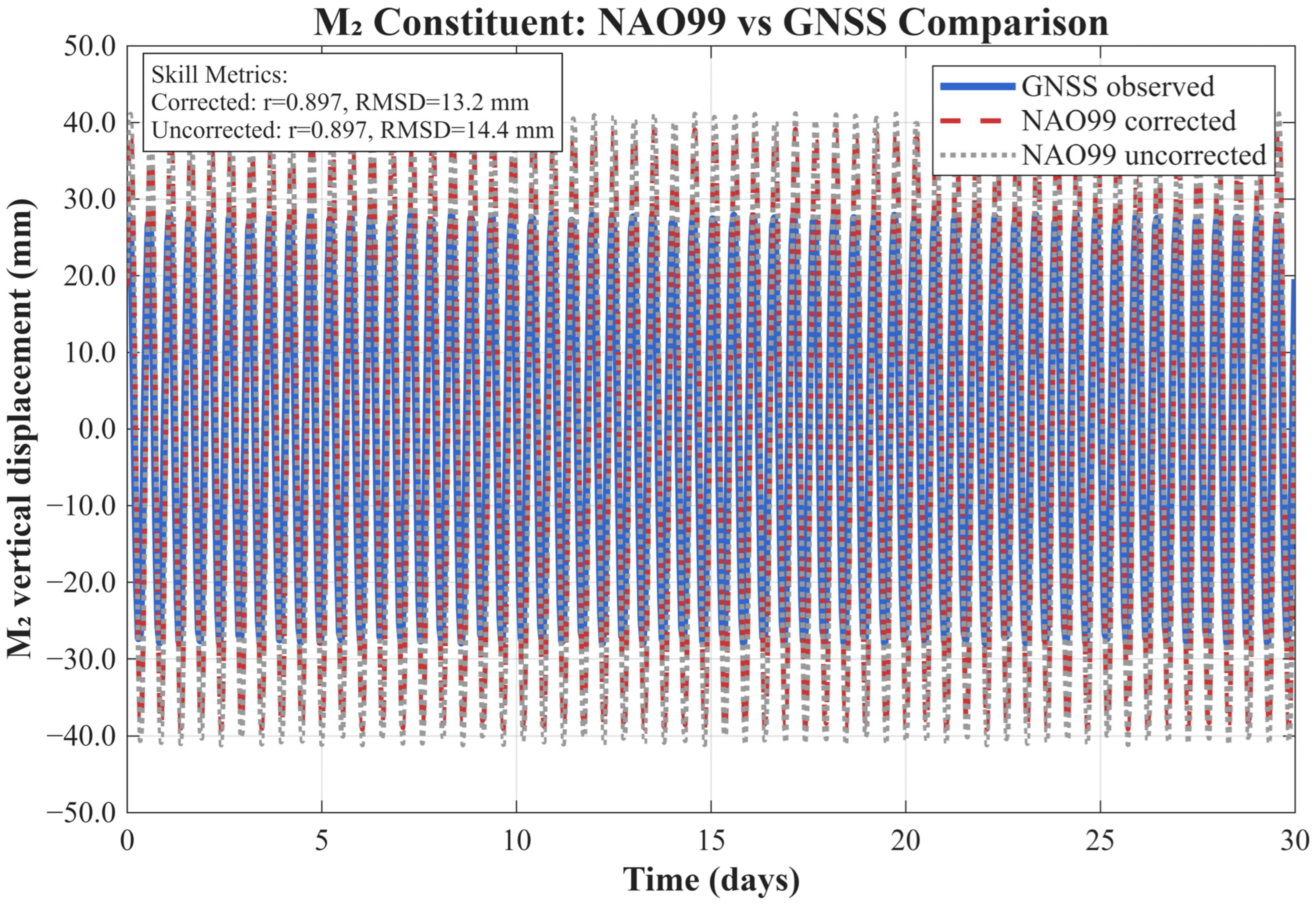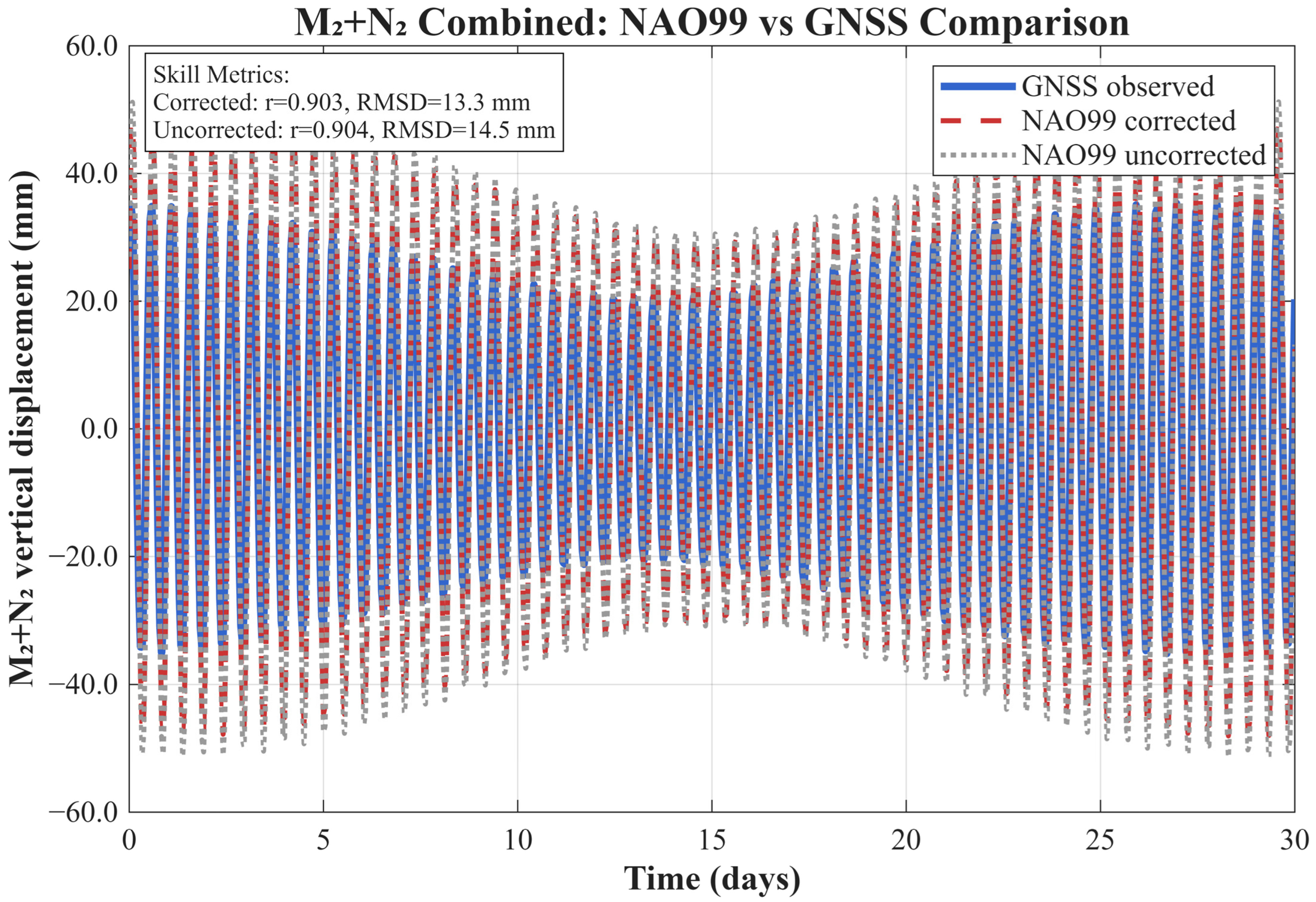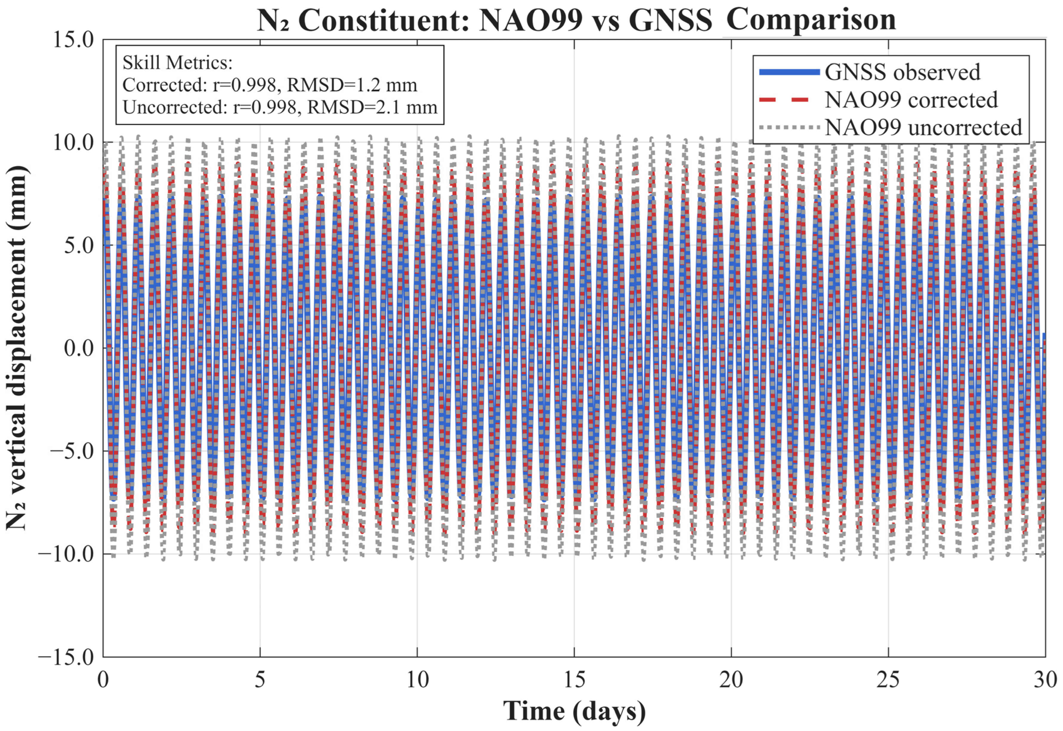 To assess the ability of the model to reproduce the dominant semi-diurnal loading signature, synthetic tidal signals were reconstructed by combining the M2 and N2 constituents from both GNSS observations and NAO99 predictions. Time-series comparisons were conducted over 30-day windows, allowing multiple tidal cycles to be examined while minimizing seasonal contamination. This composite comparison provides an integrated evaluation of amplitude scaling, phase alignment, and the representation of the fortnightly modulation arising from M2–N2 interference.