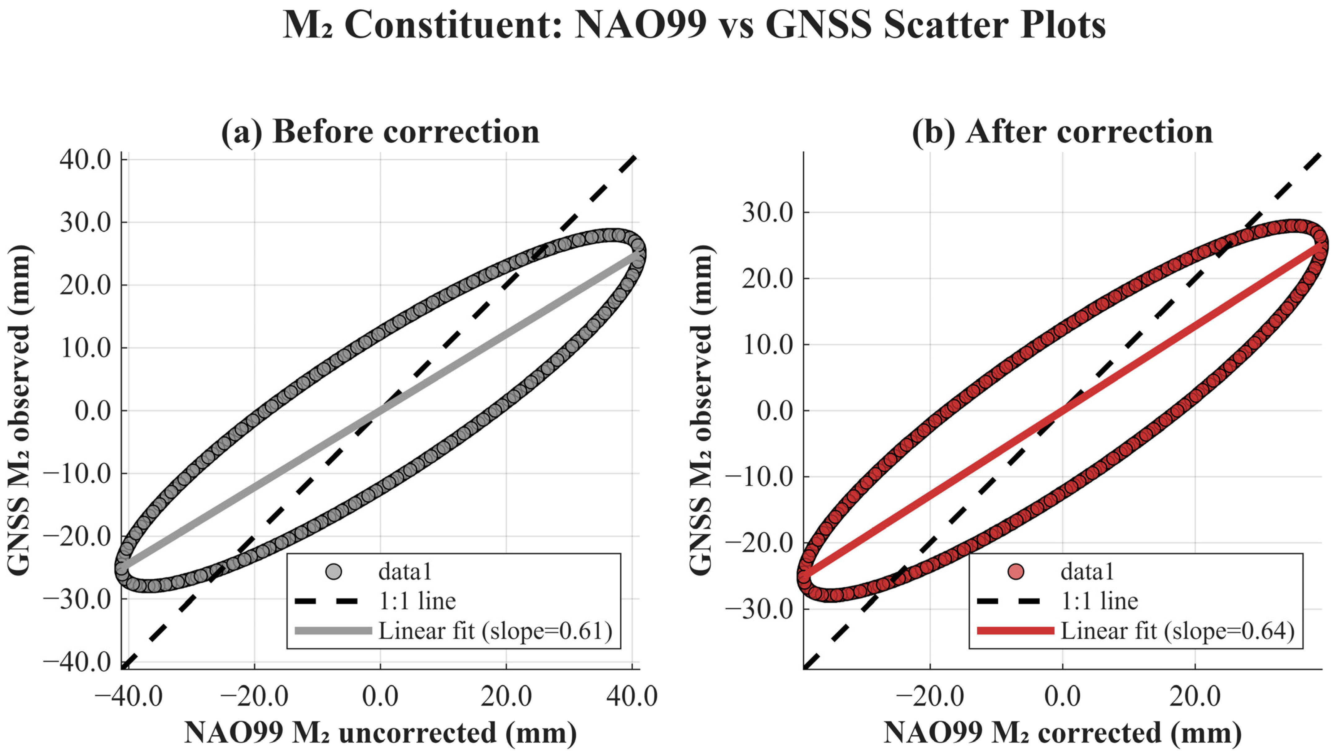 Figure 10, which presents scatter plots for the M2 constituent before and after correction. After applying the LLN and site-scale adjustments, the corrected results cluster more tightly along the 1:1 reference line, indicating enhanced amplitude consistency between NAO99 predictions and GNSS observations.