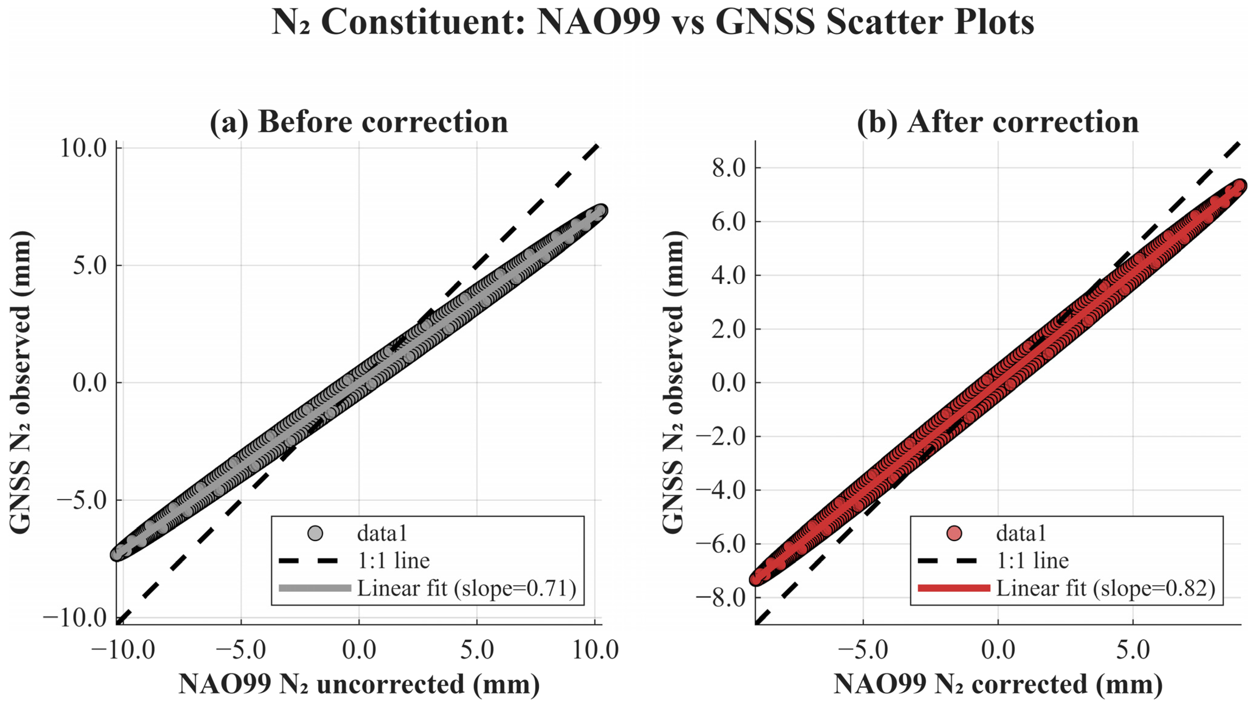 Skill scores calculated from the quality-controlled analysis windows indicate a strong agreement between the corrected NAO99 predictions and the GNSS reconstructions for the M2 constituent, with a high correlation coefficient (r), and a moderate-to-high correlation for N2. Compared to the uncorrected model, the corrected NAO99 results show a clear reduction in root mean square difference (RMSD) and a smaller mean bias for both constituents. Linear regression analyses further demonstrate that the amplitude scaling for M2 converges toward a near-unity slope after correction, confirming improved consistency between modeled and observed signals. For N2, the regression slope also approaches unity but remains slightly conservative, likely reflecting unresolved effects of local bathymetry and complex coastline geometry that are not fully captured by the background tide model.