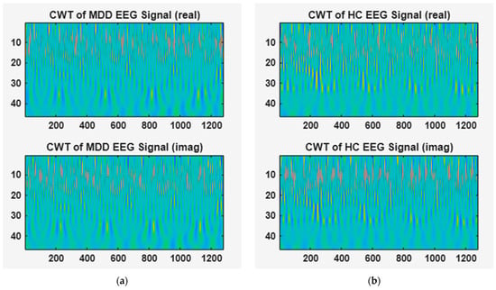 Figure 3. Time–frequency features of EEG signals obtained using CWT. (a) CWT of MDD EEG signal, (b) CWT of HC EEG signal.
