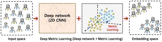 In this study, we applied deep metric learning (DML), which is a technique that integrates deep learning-based representation learning and metric learning [28], to enhance the discriminative power of EEG signals for diagnosing MDD. The core idea of DML is to project input data into an embedding space through a deep neural network and to learn a distance space in which samples belonging to the same class are positioned close together, whereas those from different classes are placed farther apart [29]. Through this process, the model learns a distance-based representation function that can effectively distinguish the similarity and difference between EEG signals. Figure 4 shows a conceptual overview of the DML architecture, illustrating how input EEG signals are projected into an embedding space via a 2D CNN-based deep network, in which class separability is optimized through metric learning.