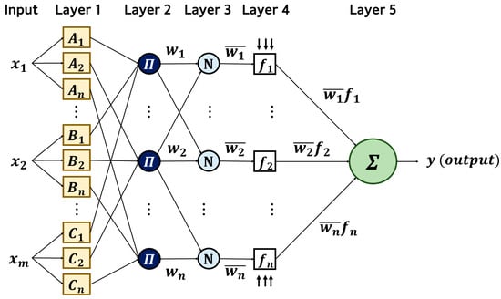 The adaptive neuro-fuzzy inference system (ANFIS) is a hybrid inference model that combines the strengths of fuzzy inference and artificial neural networks (ANNs). First proposed by Jang [31], the ANFIS is designed to effectively model nonlinear and complex systems by integrating the rule generation capability based on fuzzy logic with the learning capability of neural networks. The ANFIS automatically learns fuzzy rules in the form of “If–Then” from input–output data, and the parameters of each rule are optimized using a combination of the backpropagation (BP) algorithm and the least squares estimation (LSE) method [32]. This structure has the significant advantage of imparting the adaptive learning capability of neural networks while maintaining the interpretability of fuzzy systems.