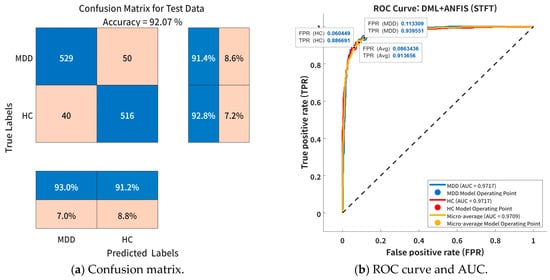 Figure 7 illustrates the classification performance of the proposed DML + ANFIS model using STFT-based time–frequency features at the optimal cluster configuration (k = 5). Figure 7a presents the confusion matrix for the test dataset. The model achieved high classification performance for both MDD patients and HCs, with classification accuracies of 91.4% and 92.8%, respectively. A total of 50 MDD samples and 40 HC samples were misclassified. Figure 7b presents the receiver operating characteristic (ROC) curve and the AUC for the same model. For the MDD group, the true positive rate (TPR) and false positive rate (FPR) were 0.9395 and 0.1133, respectively, while for the HC group, the TPR and FPR were 0.8867 and 0.0604, respectively. These results indicate that the model effectively maintained high sensitivity while minimizing false positive errors. The AUC values for both MDD and HC were 0.9717, demonstrating that the model was capable of near-perfect discrimination between the two groups. Furthermore, the micro-averaged AUC was 0.9709, thus confirming the model’s excellent overall discriminative capability in EEG-based MDD diagnosis.