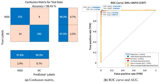 Figure 8. Classification performance of proposed DML + ANFIS model (k = 3) using CWT-based time–frequency feature embedding: (a) confusion matrix for test dataset, and (b) ROC curve and AUC values for MDD and HC groups.