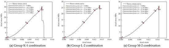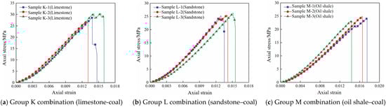 The uniaxial compressive stress–strain curves of the rock–coal combination with different rock properties are given in Figure 2. The upward slope of the stress–strain curves shows that Group K combination (limestone-coal) > Group L combination (sandstone–coal) > Group M combination (oil shale–coal), and the corresponding rising slopes of the average stress–strain curves are 2416, 1807, and 1485. This is because oil shale has relatively low strength and large deformation compared with limestone and sandstone in this test, and the oil shale–coal combination is more susceptible to deformation under axial compressive stress, which leads to a more “gentle” rise in the pre-peak phase of the stress–strain curve.