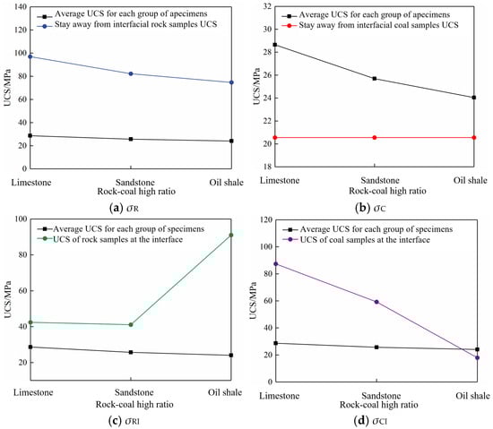 According to Equations (1), (4), and (5), σR, σC, σRI, and σCI can be obtained for the combinations of Group M, as shown in Table 3 and in the oil shale–coal combinations, σR < σRI and σC > σCI.