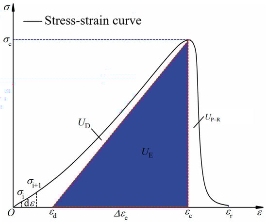 From the uniaxial compression loading and unloading tests of the combination, it is known that the unloading path before the peak is consistent with the slope of the stress–strain curve. The dissipated energy density UD and the internal stored elastic energy density UE, when the combination is loaded, can be obtained from Equations (6) and (7), respectively.