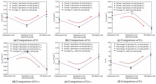 A comparison of the energy density of each energy density of the rock–coal combination with different rock properties is shown in Figure 6. As shown in Figure 6, with increasing axial stress, the external energy is input continuously. The average UI of the combinations of Group K is 0.181965 J × mm−3, that of the combinations of Group L is 0.160144 J × mm−3, and that of the combinations of Group M is 0.188744 J × mm−3. The average UI value of M group > K group > L group. Only when the input energy reaches the energy storage limits of the combination does the combination undergo failure. Thus, the larger the UI, the greater the strength of the corresponding combination. Moreover, the average UI of the combinations of Group K (limestone–coal) is larger than the average UI of the combinations of Group L (sandstone–coal). Based on the aforementioned results, the stress–strain curve of the oil shale coal assemblage is more relaxed. During the uniaxial compression process of the oil shale coal assemblage, according to Hooke’s law and relationship (8), the greater deformation of the oil shale causes it to store more elastic energy. Therefore, the average UI of the combinations of Group M (oil shale–coal) is the largest. The average UE of the combinations of Group M is the largest, with a value of 0.168858 J × mm−3, and the average UE of the combinations of Group L is the smallest, with a value of 0.124605 J × mm−3.