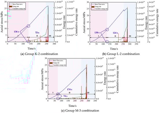 The K-2, L-2, and M-3 combinations were selected to analyze the acoustic emission energy rate and cumulative energy rate in the damage process. Figure 7 shows the uniaxial compressive stress, acoustic emission energy rate, and cumulative energy rate of rock–coal combinations with different rock properties. As shown in Figure 7, the progressive damage process of the combination under uniaxial compression is divided into three stages according to the number of acoustic emission energy rate signals and the magnitude of the peak value: the quiet stage (Stage I), the active stage (Stage II), and the sudden increase stage (Stage III). Meanwhile, the acoustic emission energy rate signal characteristics of the combination during the loading process show good agreement with the stress-time curve.