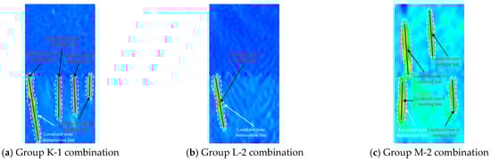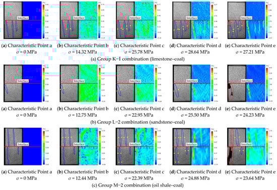 Characteristic Point e is located in the destructive stage after the peak of the stress–strain curve, and the K-1 and L-2 combinations are accompanied by the convergence and penetration of primary and nascent cracks in the coal samples. The deformation localized zones of the combinations are elongated, intersected, and connected, which ultimately leads to their destruction. However, the deformation localized zones of the M-2 combinations in the oil shale and coal samples evolve drastically and penetrate through the interface between the rock and coal, which ultimately leads to the destruction of the oil shale and the coal samples. The corresponding σ values of the K-1, L-2, and M-2 combinations are 27.21 MPa, 24.23 MPa, and 23.64 MPa, respectively, and the maximum principal strain values are 0.0607, 0.0402, and 0.0170, respectively.