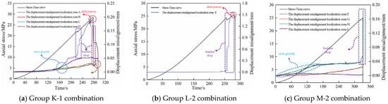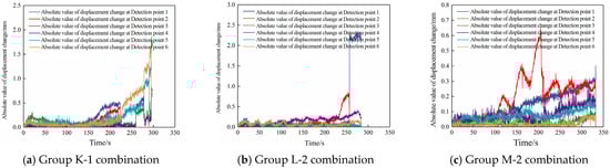 As seen from Figure 13, in the preloading period, the evolution of the absolute displacement changes at Monitoring Points 1–6 are consistent. When the K-1 combinations are loaded to 160 s, the absolute displacement changes of Monitoring Points 1 and 2 increase rapidly. When loaded to 228 s, the absolute displacement changes of Monitoring Points 5 and 6 show a “sudden increase”. When loaded to 260 s, the absolute displacement changes of Monitoring Points 3 and 4 show a “sudden increase”. The changes in the absolute displacement of the monitoring points are mainly affected by the expansion of the deformation localization zone, as well as penetration and displacement misalignment in the combinations. The evolution law of the absolute displacement changes of Monitoring Points 1–6 of the L-2 combination remains consistent at 230 s before loading. During loading at 230 s, the absolute displacement changes of Monitoring Point 2 grow rapidly. During loading at 257 s, the absolute displacement changes of Monitoring Point 1 show a “sudden increase”. During loading at 260 s, the absolute displacement changes of Monitoring Points 3 and 4 show a “sudden increase”. During loading at 257 s, the absolute displacement change of Monitoring Point 1 shows a “sudden increase”. The growth of the absolute displacement changes at Monitoring Points 1 and 2 is mainly affected by the deformation localization zone E. During the loading process, the absolute displacement changes at Monitoring Points 1–5 of the M-2 combinations show a trend of slow growth. During loading at 108 s, the absolute displacement changes at Monitoring Point 2 show large fluctuations, with an overall “sudden increase” followed by a “sudden decrease”. The overall “sudden increase” is followed by a “sudden decrease”. This is mainly due to the uniaxial compression of the oil shale–coal composite, during which the cracks of the oil shale and coal samples penetrate at the interface.