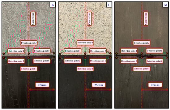 Layout of the monitoring points for the displacement changes of the rock and coal samples at the interfaces of the rock–coal combinations with different rock properties.