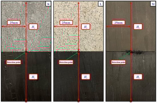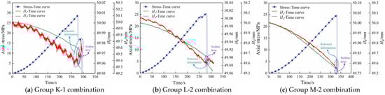 The change curves of the axial stress, Hr and Hc of the rock–coal combinations with different rock properties with time are shown in Figure 15. As shown in Figure 15, Hr and Hc show an overall fluctuating and decreasing trend during the damage process of the K-1, L-2, and M-2 rock–coal combinations, in which the fluctuations of Hr and Hc of the combination are mainly affected by the length and number of primary cracks of the rock and coal samples.