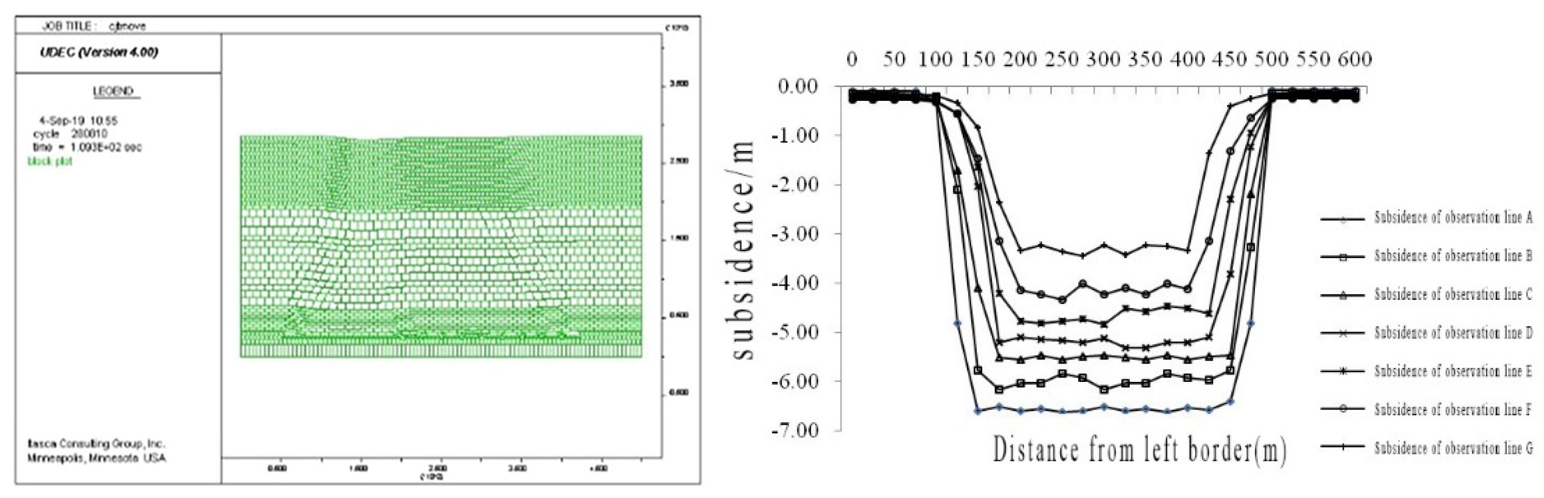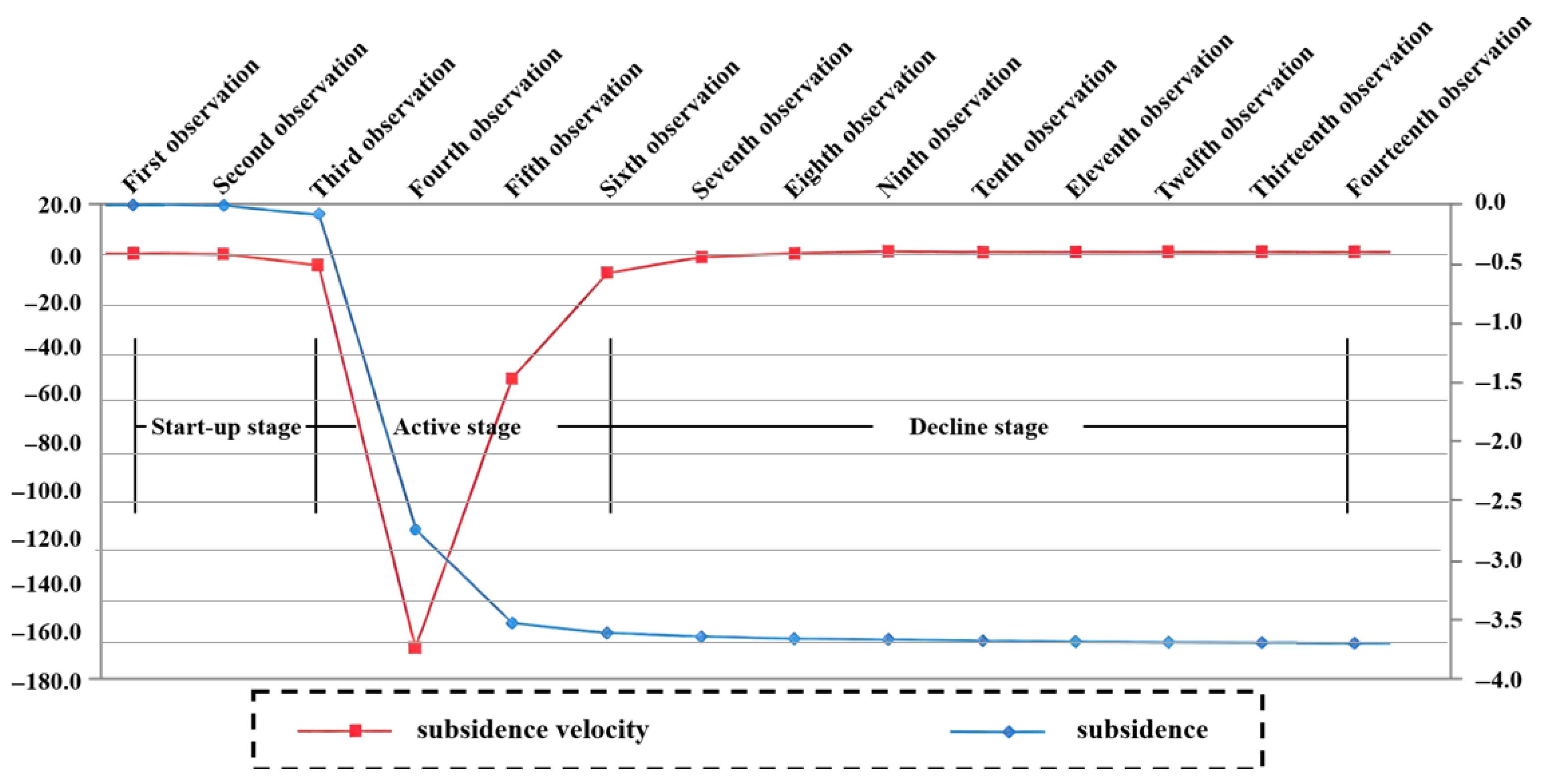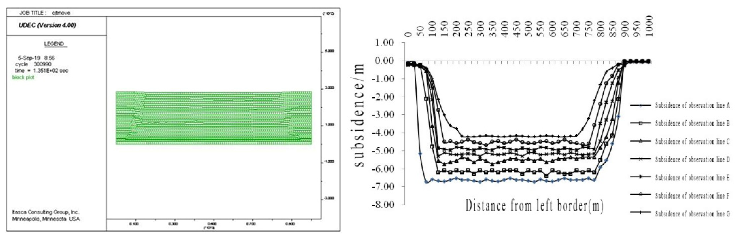 | Excavation Distance | Overburden Caving Form | Subsidence Curve of Observation Line |