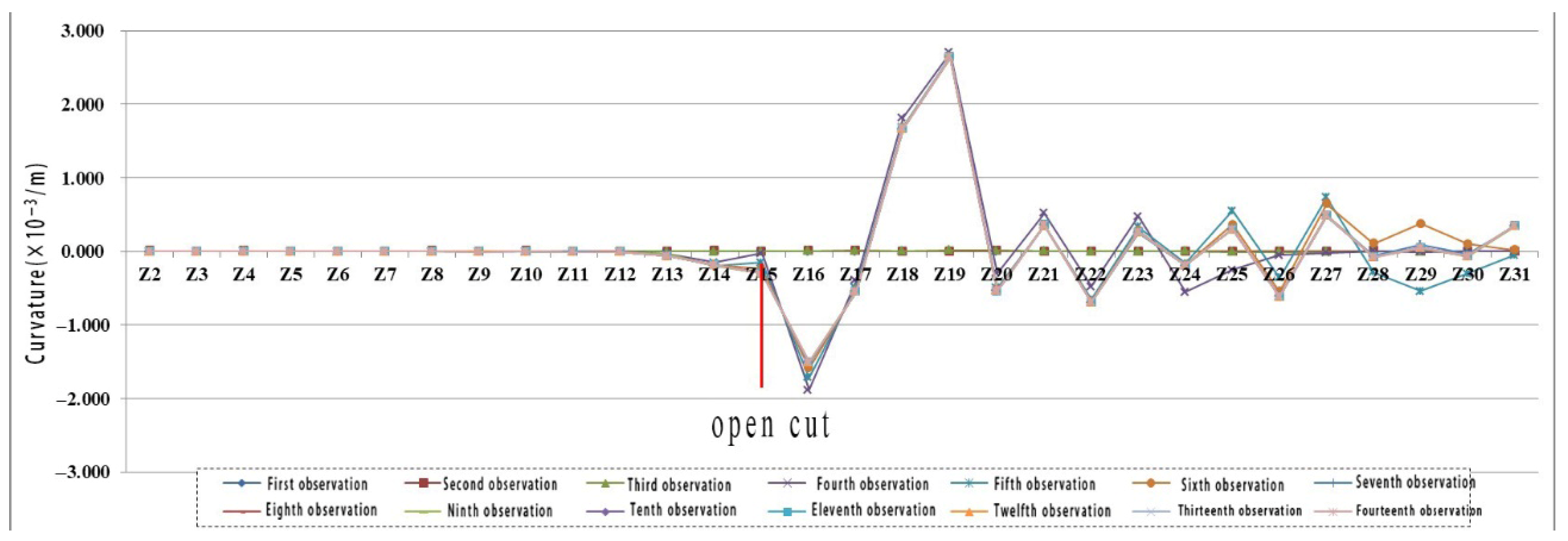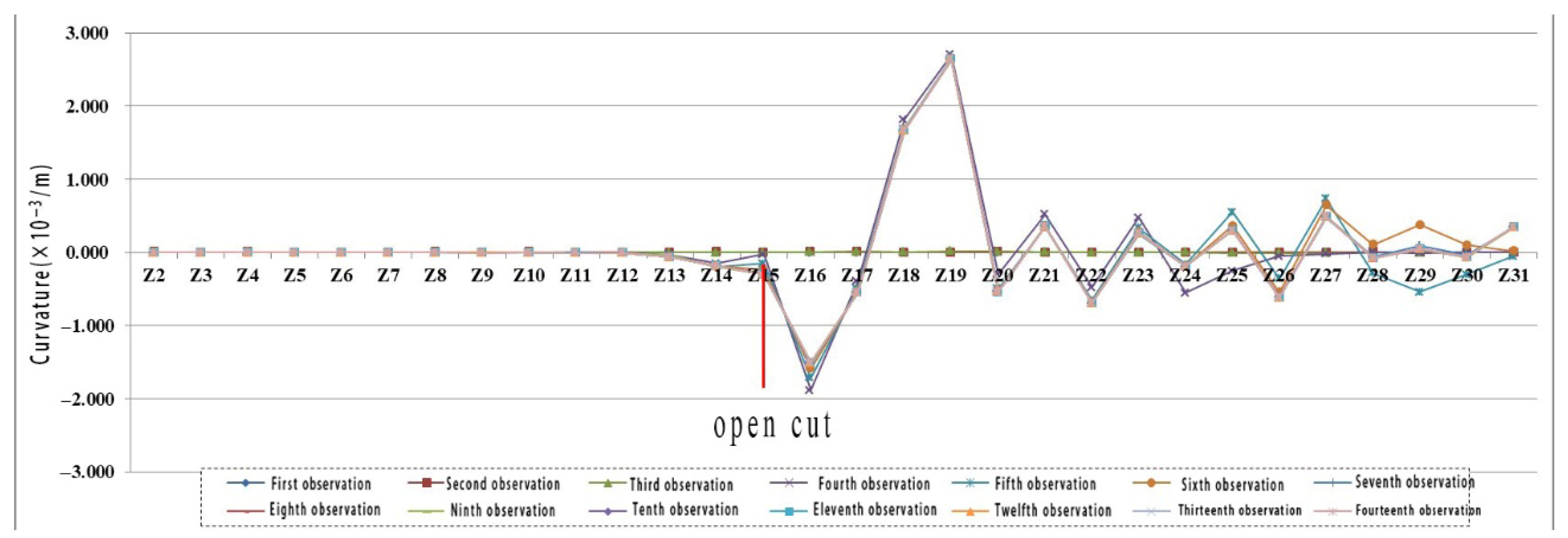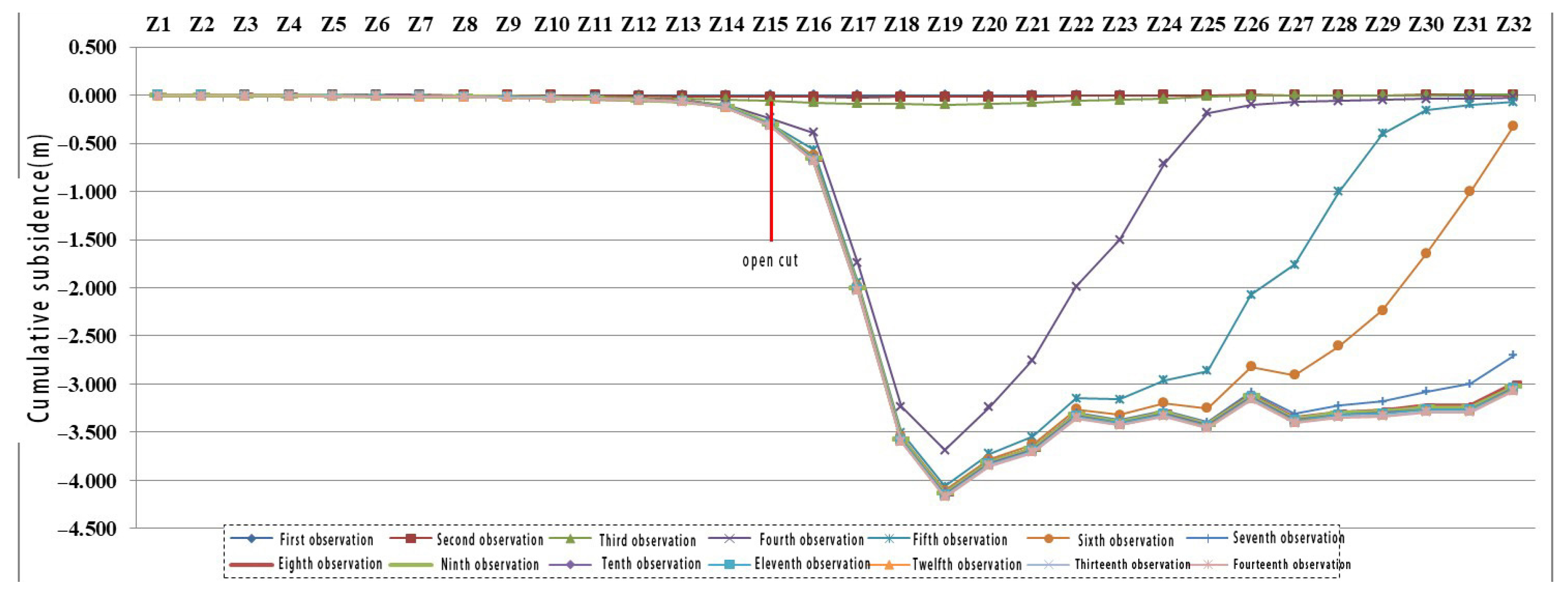 | Excavation Distance | Overburden Caving Form | Subsidence Curve of Observation Line |
