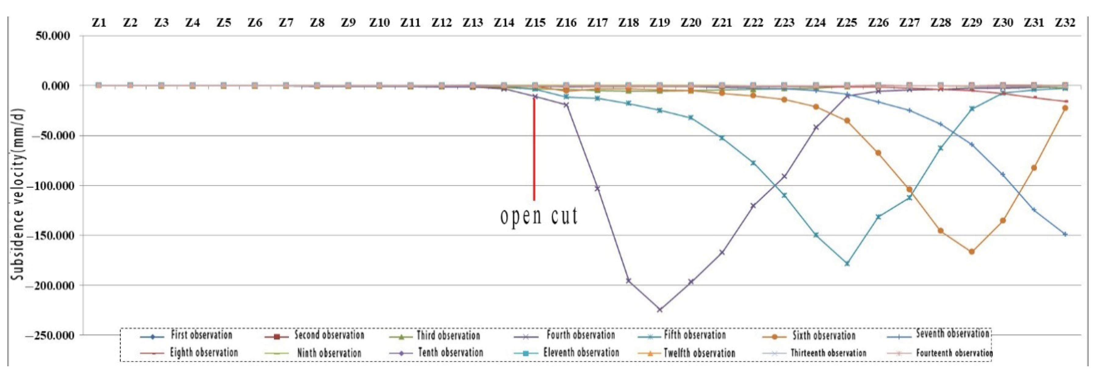 5.3.1. Study on the Movement Law of Bedrock and Surface Along the Strike Direction (Z Line)