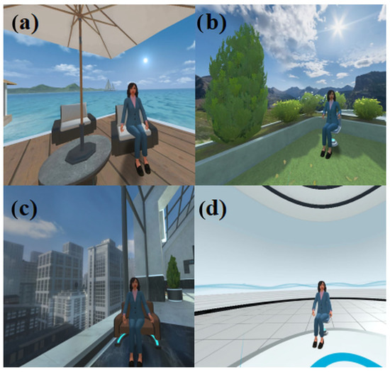 Four virtual environments used in the study: (a) seaside coastal setting, (b) green garden setting, (c) urban indoor office setting, and (d) sci-fi setting. All images were taken from the perspective of a participant, looking at the experimenter’s avatar.