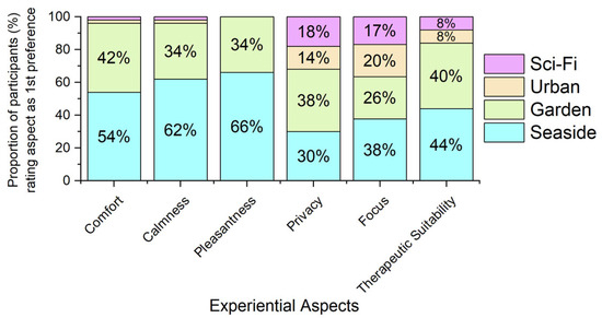 Proportion of participants selecting each virtual environment as their first preference for each experiential aspect. Stacked bars represent the percentage of participants who ranked the seaside, garden, urban, or sci-fi environment as their top choice.