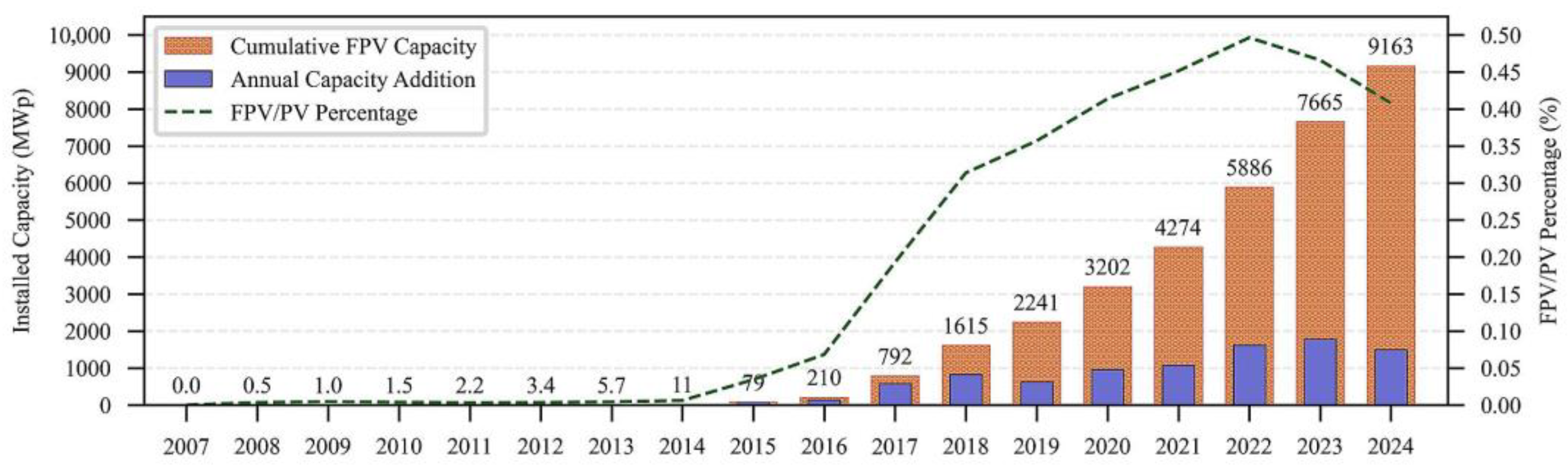 - Floating Solar: Emerging Technology Doubling Installed Power per Year. Available online: https://ratedpower.com/blog/floating-solar/ (accessed on 20 October 2025).