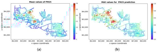 (a) mean true values and (b) corresponding prediction errors (MAE) for roads (in μg/m3). Spatial coordinates are given in the ETRF2000-PL/CS92 coordinate system (EPSG code 2180).