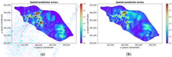 Spatial prediction errors (in μg/m3) obtained for prediction for map 546, 12 December, Monday, at 6:00 PM (a) based on training set (0–196) and (b) based on training set (0–528).