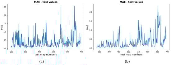 Furthermore, for predictions relating to later periods of the year, smaller training sets, in our case containing only sequences of exactly 200 terrain maps, yield worse results (not shown in Table 2) than those obtained based on observations that include all previous data. In addition to the results presented in Table 2, we also computed . The values ranged from 0.988 (for the training set 0–432) to 0.995 (for the training set 0–528). In the case of global results (the Global test columns in Table 2), the normalized MAE values (NMAE), i.e., the MAE values divided by the average values corresponding to the periods in which MAE was determined, ranged from 5.5% to 9.9%.