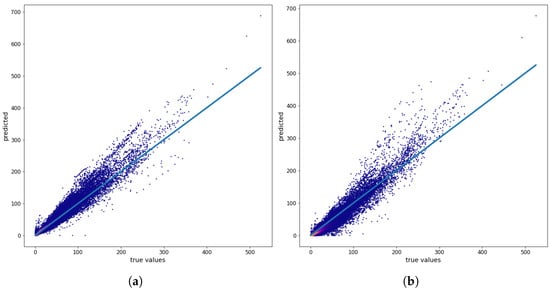(a) VOC true values versus MLP-PCA model-predicted values using measurements from monitoring stations and (b) VOC true values versus MLP-PCA model-predicted values using VOC measurements from monitoring stations for 546 map (12 December, Monday, at 6:00 PM) prediction. All values are given in μg/m3.
