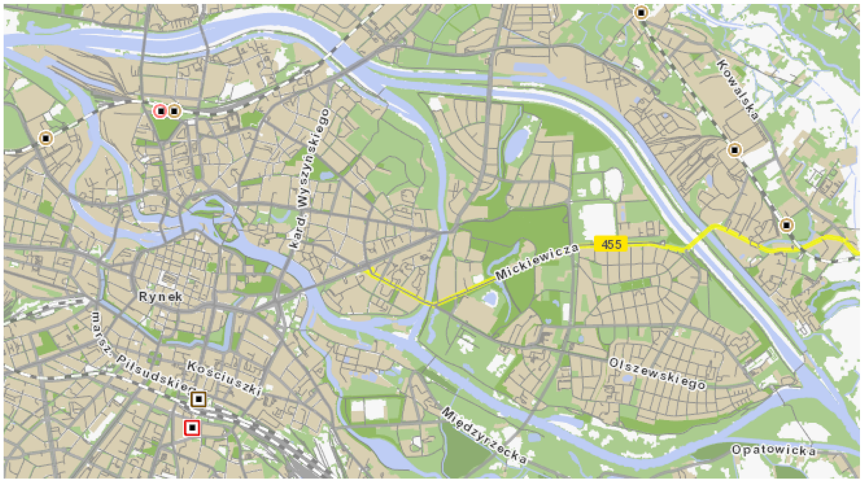 Figure 1 shows the area of interest monitored by Lemitor. This area is located between longitudes 17.0070° E and 17.1290° E and latitudes 51.0933° N and 51.1346° N and is surrounded by the canals and channels of the Oder River. It consists of two islands divided by the Old Oder River.