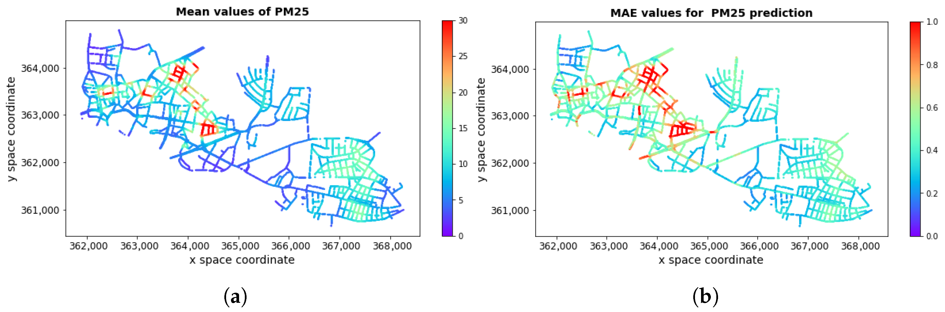 Figure 5 shows the variation of the approximation errors (MAE) for individual pollution maps determined by the surrogate model for a specific date and time. The values in