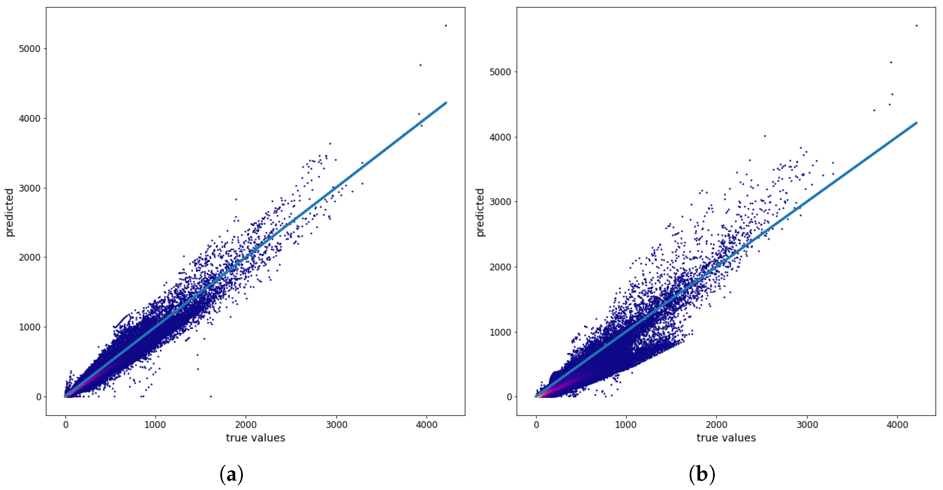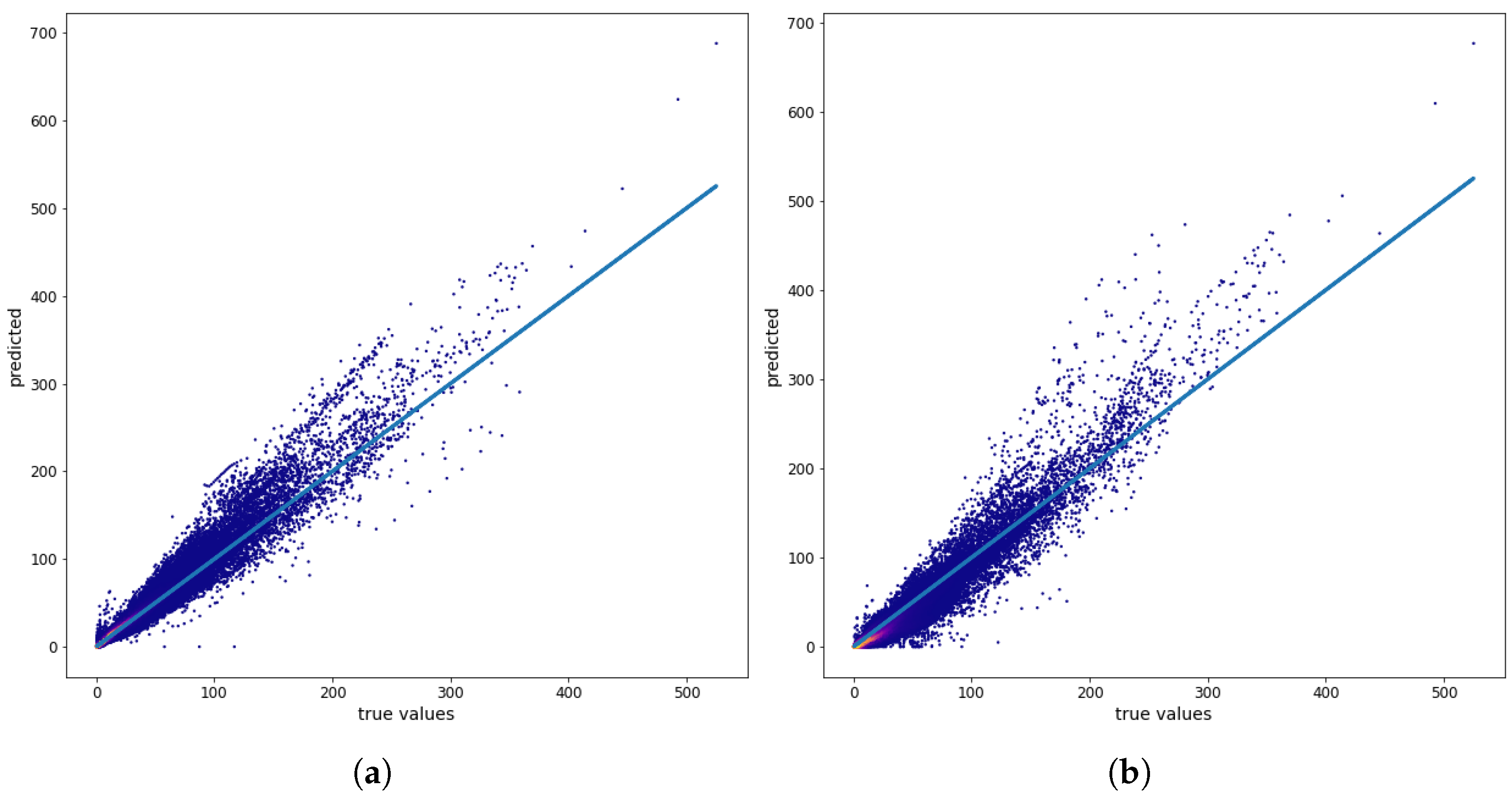 Figure 6 shows the relationship between the true values (the values of the physical model) and the prediction results for a single map (546, 12 December, Monday, 6:00 PM), with training on the 0–196 training data.