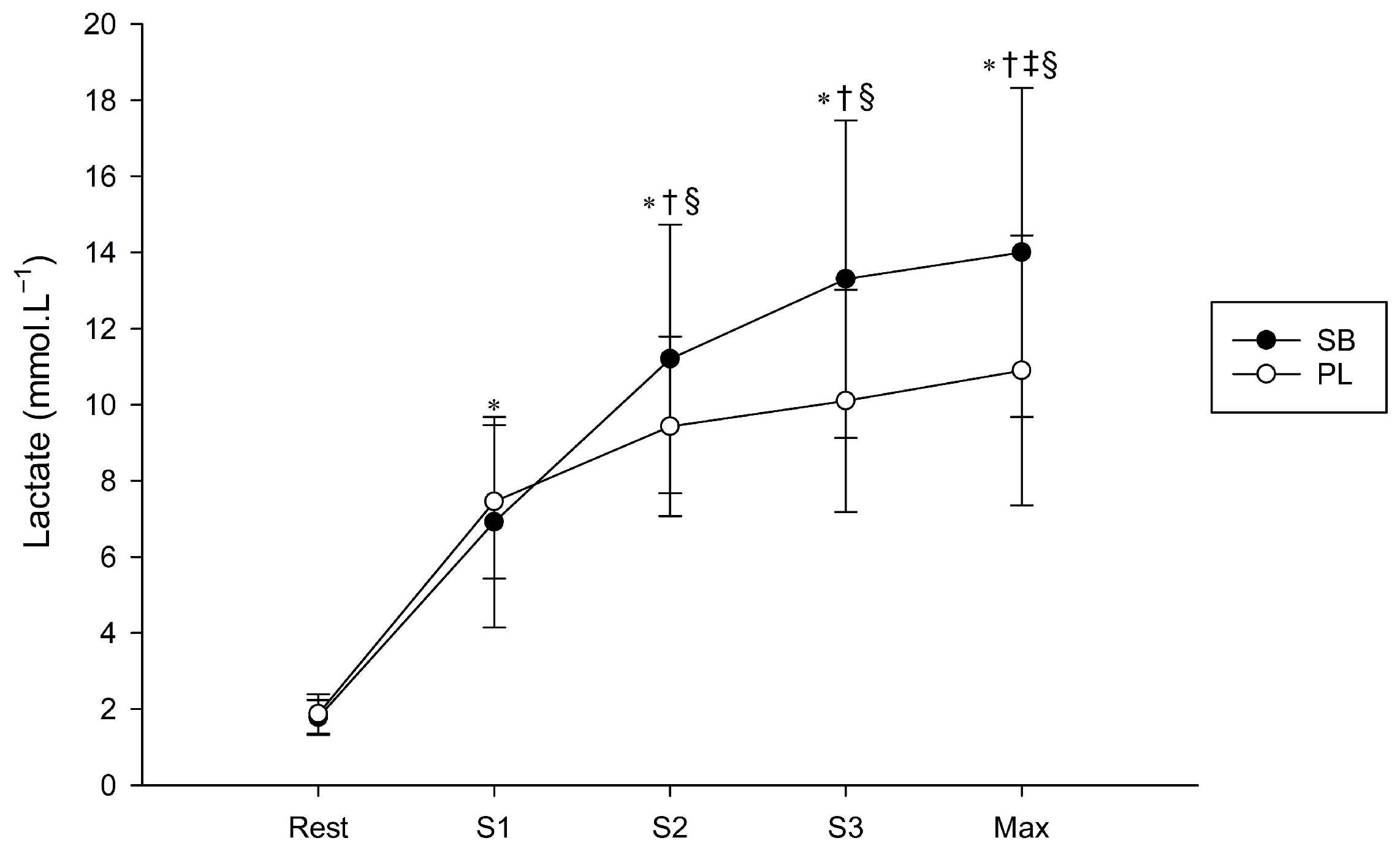 - Granier, P.L.; Dubouchaud, H.; Mercier, B.M.; Mercier, J.G.; Ahmaidi, S.; Préfaut, C.G. Effect of NaHCO3 on lactate kinetics in forearm muscles during leg exercise in man. Med. Sci. Sports Exerc. 1996, 28, 692–697. [Google Scholar] [CrossRef]