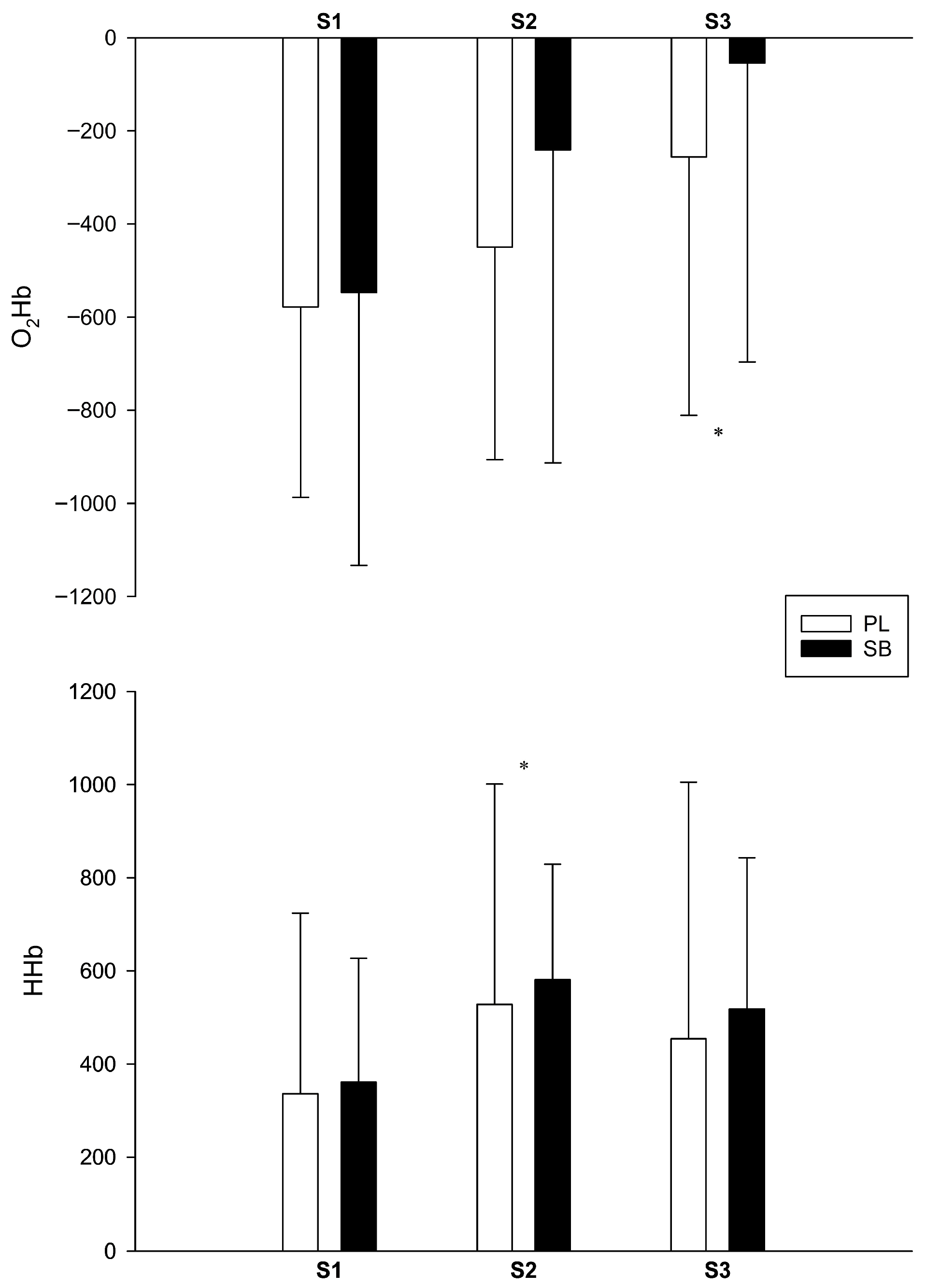 | O2Hb (a.u.) | −578 ± 409 | −450 ± 456 | −256 ± 555 † | −547 ± 586 | −241 ± 672 | −54.3 ± 642 † |